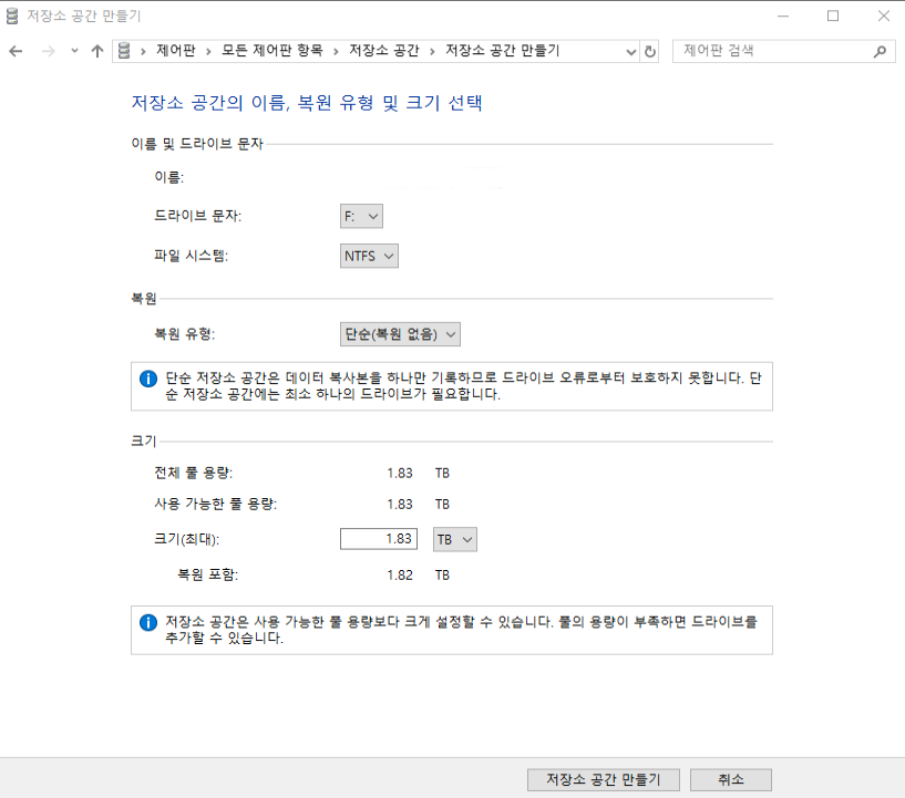 2. 제어판 – 저장소공간 – 새 풀 및 저장소 공간 만들기로 들어갑니다.